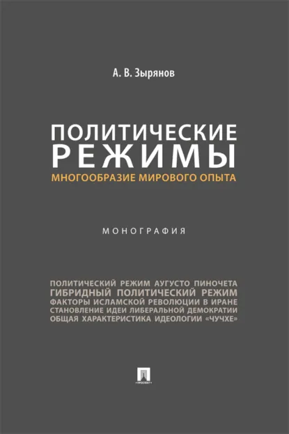 Настоящая работа посвящена комплексному анализу большинства проявляющих себя в мировой практике (зарубежной и отечественной) политических режимов: военного авторитаризма, гибридного режима, исламского фундаментализма, либеральной демократии, милитаризма, переходного режима, сионизма, социализма, трайбализма, фашизма, «Чучхе». Каждый из них раскрывается в трех аспектах: история становления, характерные особенности, специфика реализации.