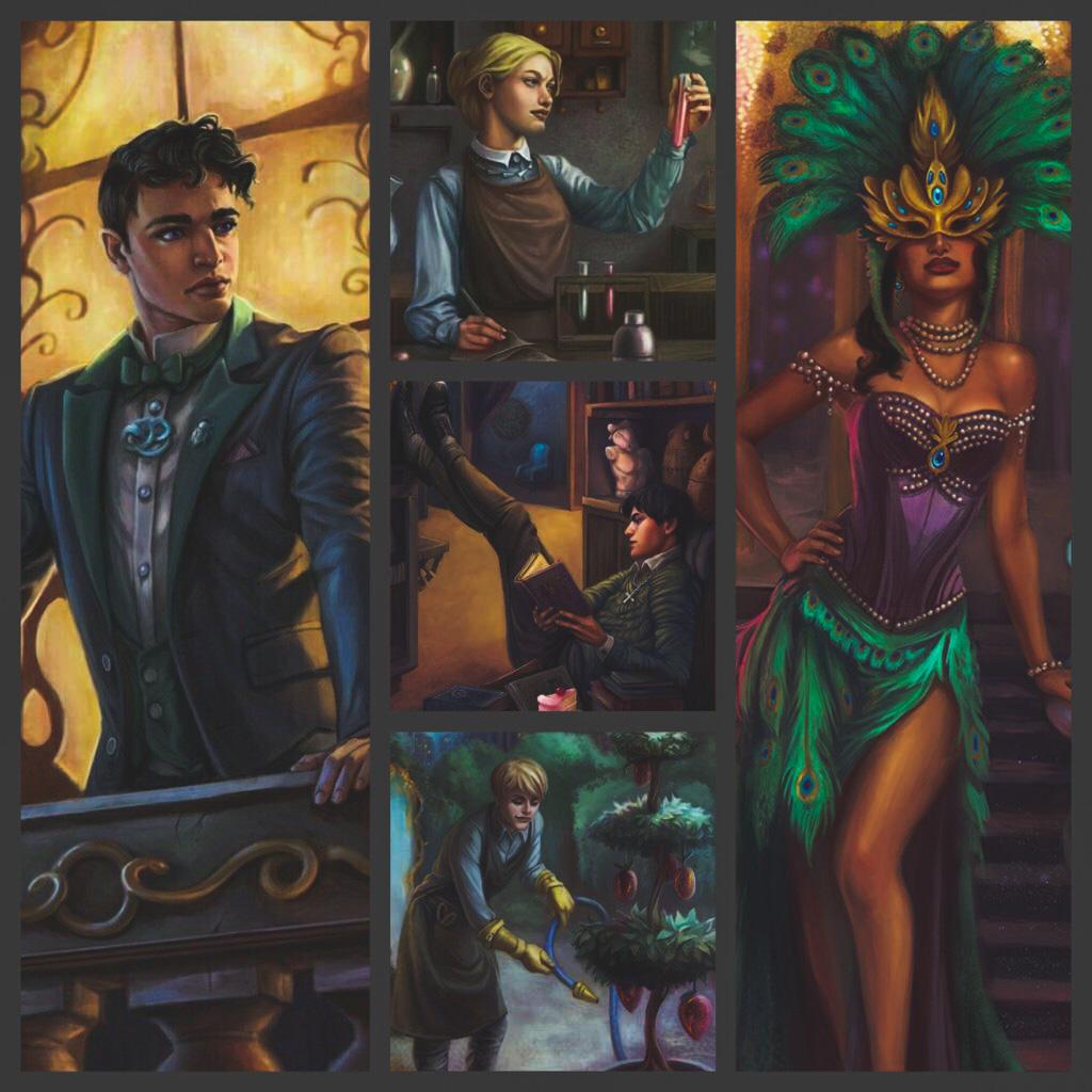 Северин, которого окутывает тайна его происхождения и который находится в борьбе за свое место патриарха Дома. Он владеет лучшим отелем в городе и в нем же живут остальные герои. В отеле танцует обворожительная и фееричная Энигма, на выступления которой стягивается весь мир. Энигма загадочна, непостоянна и меняет кавалеров как перчатки. Она будоражит публику скандалами и тайнами, поддерживает имидж недосягаемой красавицы. Энигма - прикрытие. В действительности это Лайла, которую с Северином связывали романтические отношения. Лайла сотворена из костей и ничего, а в восемнадцать лет она умрет, если не найдет книгу, которая может продлить ей жизнь. Северин помогает ей искать эту книгу. Тристан - сводный брат Северина. Он садовод и творец, из-под его руки взрастают великолепные цветы, статуи; он может превратить материи в нечто осязаемое подобно гончару, который из глины вылепляет посуду и вазы. Северина и Тристана воспитывали несколько отцов. Гнев, Ярость, Жадность, Чревоугодие и прочие из людских пороков. Ученый Энрике и Зофья чем-то похожи. Зофья - девушка математического склада ума, которая везде видит четкие параллели, логику, формулы и геометрию. Когда она нервничает, начинает все вокруг пересчитывать, поэтому Лайла сотворяла для нее платья со стежками таким образом, чтобы на важной миссии Зофья их считала и успокаивалась. Энрике тоже везде видит логику, он невероятно умный. Его ориентация мечется между девушками и парнями. Есть второстепенный персонаж, который может стать одним из главных. Это Гипнос - молодой и красивейший юноша, патриарх Дома. Гипноса назвали в честь бога сна, он умеет творить иллюзии.