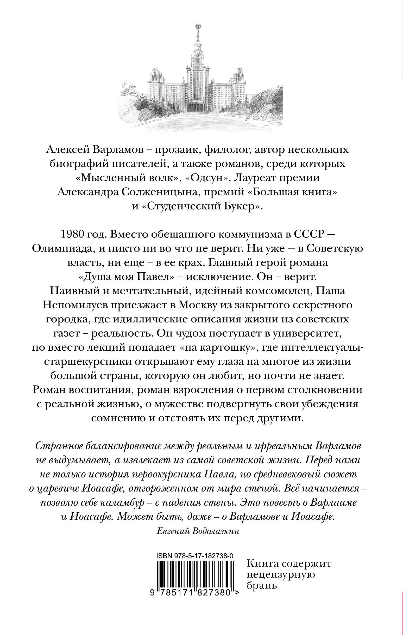 1980 год. Вместо обещанного коммунизма в СССР — Олимпиада, и никто ни во что не верит. Ни в Советскую власть, ни в ее крах. Главный герой романа “Душа моя Павел” — исключение. Наивный и мечтательный, идейный комсомолец, Паша Непомилуев приезжает в Москву из закрытого секретного городка, где идиллические описания жизни из советских газет — реальность. Он чудом поступает в университет, но вместо лекций попадает “на картошку”, где интеллектуалы-старшекурсники открывают ему глаза на многое из жизни большой страны, которую он любит, но почти не знает.