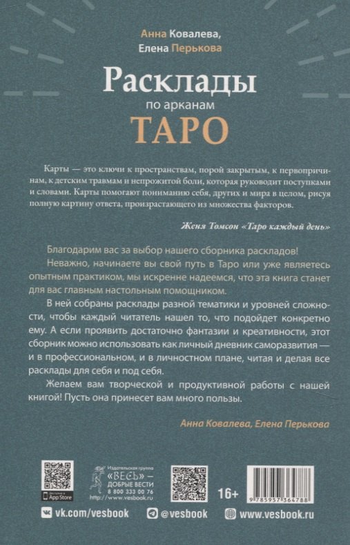 Перед вами подробный гид по осмысленной и вдохновляющей работе с Таро. В нем вы найдете 78 уникальных авторских раскладов, каждый из которых раскрывает суть соответствующего ему аркана. Этот сборник объединяет системный подход к Таро и творческую свободу в чтении раскладов. Авторы представили выстроенную систему толкования, но не призывают непреклонно следовать схемам - наоборот, предлагают вам быть смелыми, гибкими и позволить интуиции вести вас. Основная идея книги - Таро является стройной и логичной системой, в которой важны и нумерология, и внутренние связи между арканами. Также вы можете углубиться в метафорическое прочтение, где ключом к ответу становятся сами образы карт, их визуальный язык и реакции вашего бессознательного. Эта книга научит вас сочетать логическое и интуитивное, учитывать структуру и доверять импровизации, а главное - видеть в раскладе не просто гадание, а путь к самопознанию. Будьте любопытны. Будьте смелы. И начинайте прямо сейчас.