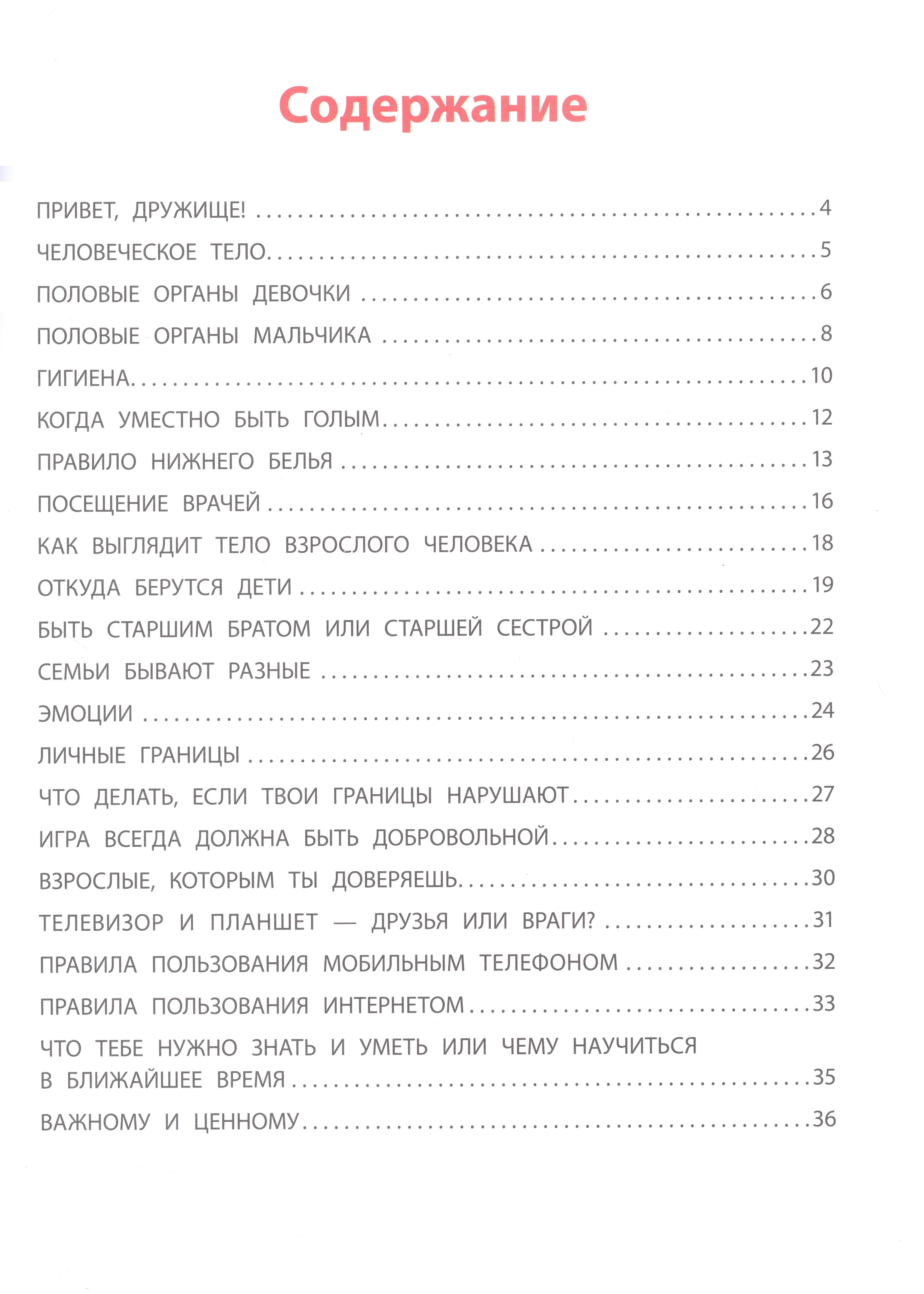 С помощью этой книги дети усвоят информацию и разберутся в вопросах, связанных с телом, поведением, отношениями и безопасностью. Так ребёнку будет полезно узнать, откуда берутся дети и как выглядит тело взрослого человека, как устроены половые органы девочек и мальчиков, почему важно никогда не разговаривать по телефону с незнакомыми людьми и важно на память знать номер телефона экстренной службы, как нужно выполнять правила гигиены и правила нижнего белья. И это ещё не всё!