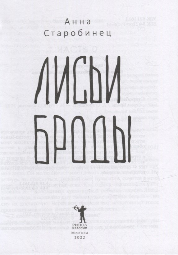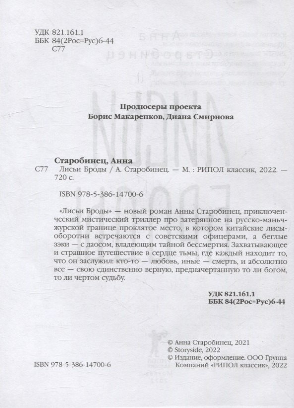«Лисьи Броды» – новый роман Анны Старобинец, приключенческий мистический триллер про затерянное на русско-маньчжурской границе проклятое место, в котором китайские лисы-оборотни встречаются с советскими офицерами, а беглые зэки – с даосом, владеющим тайной бессмертия. Захватывающее и страшное путешествие в сердце тьмы, где каждый находит то, что он заслужил: кто-то – любовь, иные – смерть, и абсолютно все – свою единственно верную, предначертанную то ли богом, то ли чертом судьбу.