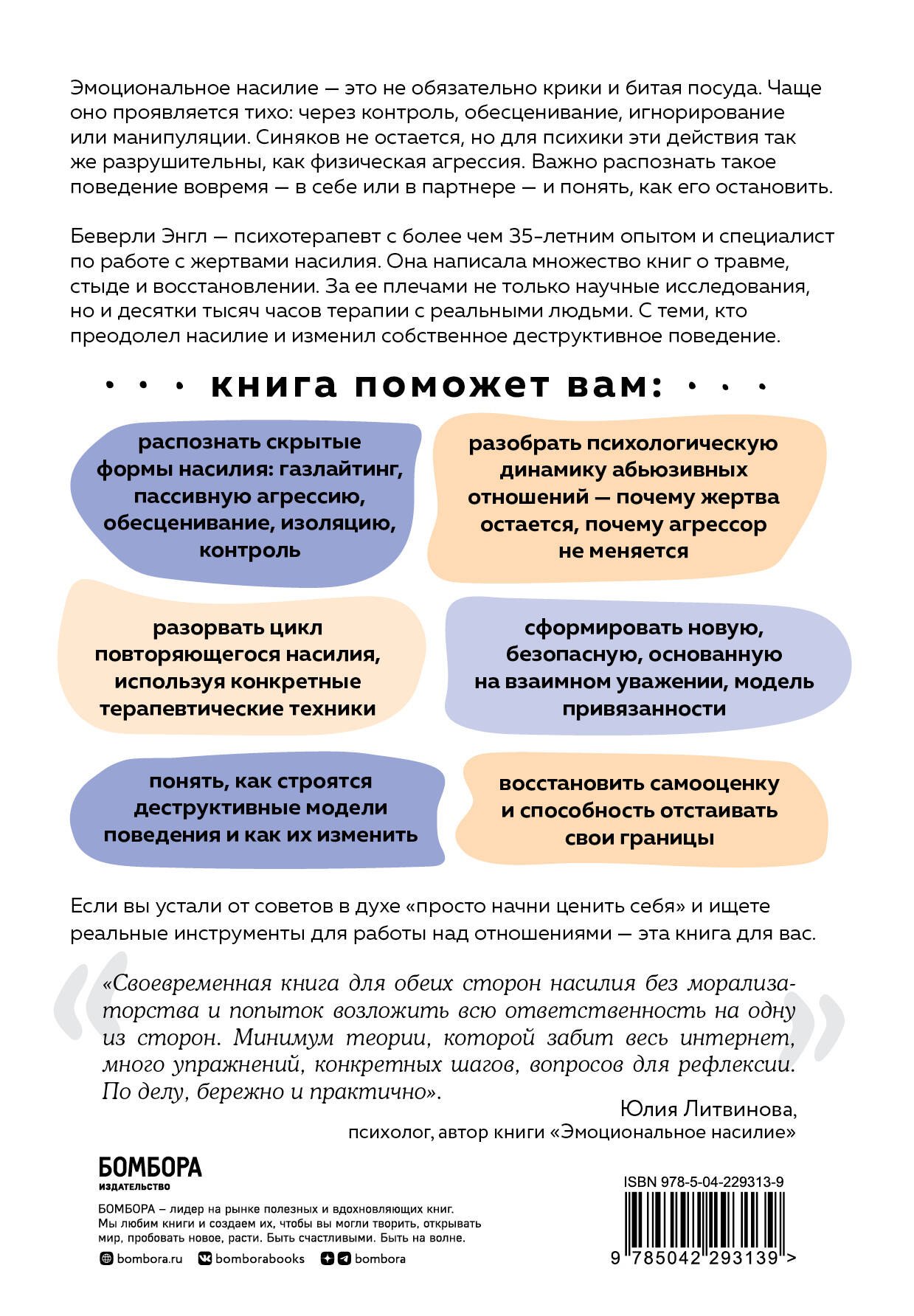 Беверли Энгл — психотерапевт с более чем 35-летним опытом и специалист по работе с жертвами насилия. Она написала множество книг о травме, стыде и восстановлении. За ее плечами не только научные исследования, но и десятки тысяч часов терапии с реальными людьми. С теми, кто преодолел насилие и изменил собственное деструктивное поведение.