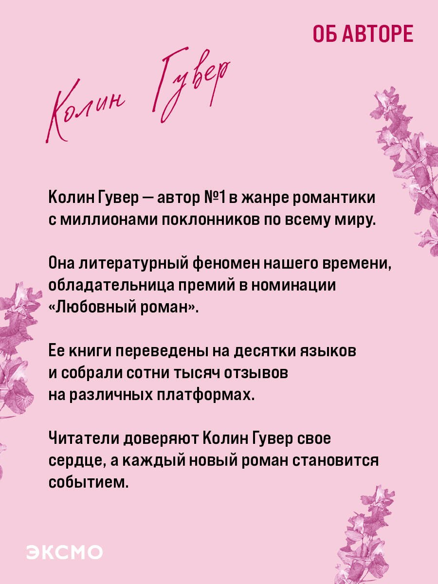 Колин Гувер – автор, которому читатели доверяют свое сердце. Ее истории доказывают: даже растоптанный цветок однажды может прорасти, чтобы стать ближе к солнцу.