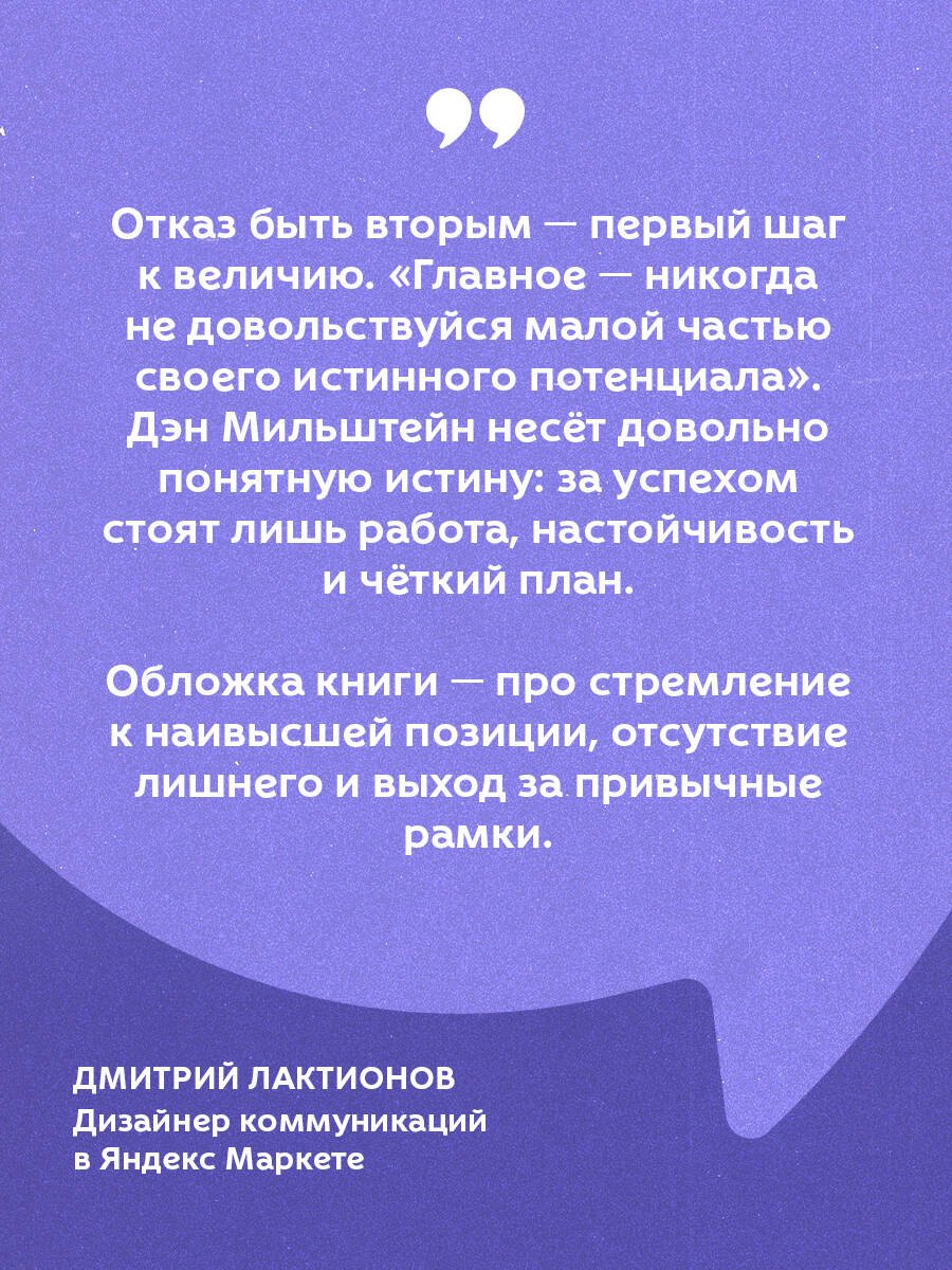 Дэн Мильштейн — основатель компании GoldStar и один из самых известных хоккейных агентов, представляющих российских игроков в НХЛ. Он сыграл ключевую роль в успехе Павла Дацюка, Никиты Кучерова, Артемия Панарина и других звезд. В этой книге Мильштейн впервые делится психологическими стратегиями, которые помогли ему и его подопечным изменить свою жизнь. Он показывает, как не сдаваться на пути к мечте, правильно расставлять приоритеты и превращать слабости в сильные стороны, чтобы добиться успеха и финансового благополучия.