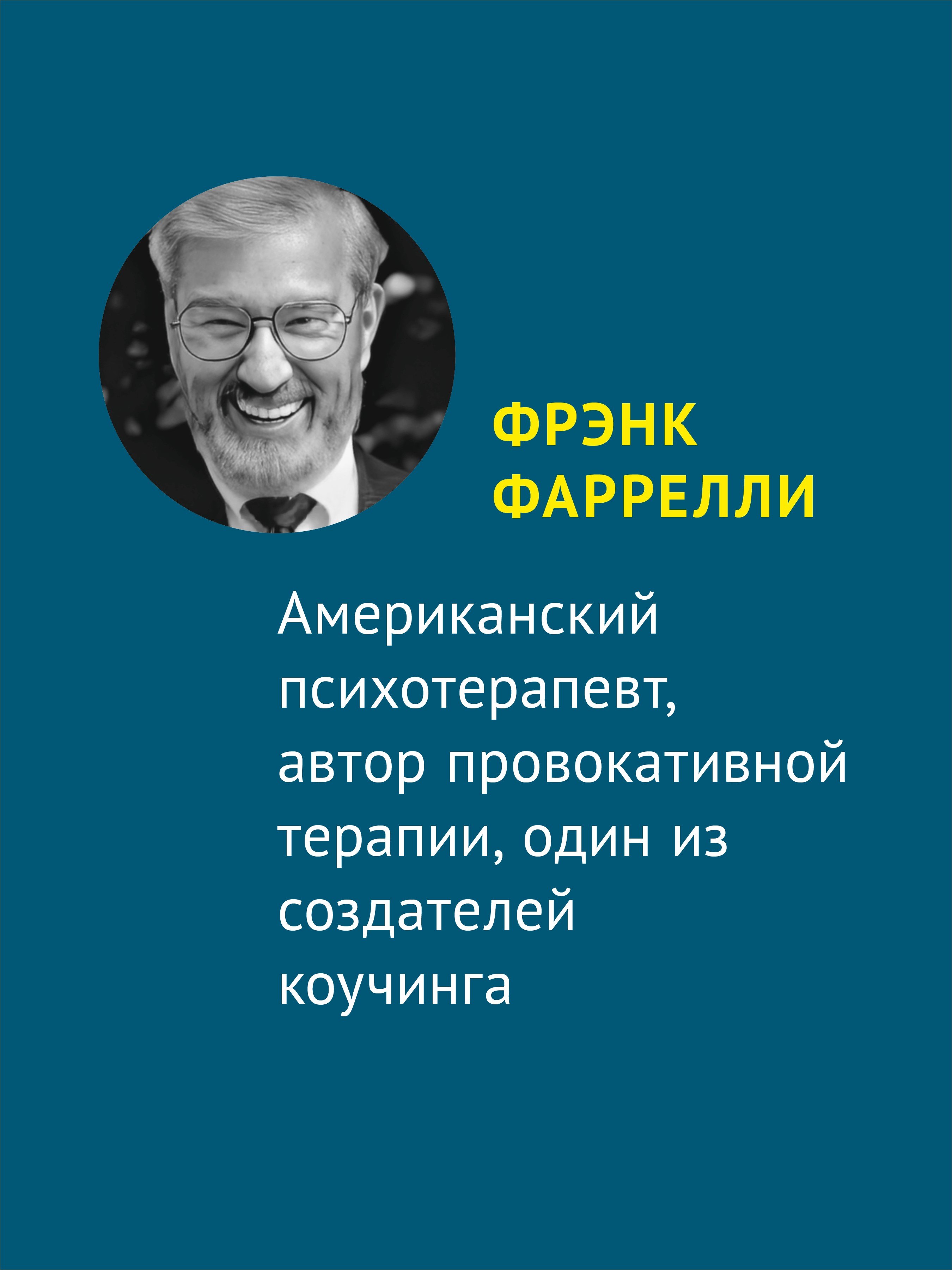 На страницах этой книги предпринимается попытка уловить удивительную сущность человеческой натуры. В том виде искусства, которым до сих пор в значительной степени является психотерапия, художников немного, но Фрэнк Фаррелли – один из них. Его жизнь, устремления, яркие поступки и неизбежные ошибки стали искрой для этого труда, задача которого – рассказать об иной философии исцеления и показать модели поведения практикующим специалистам, ещё не подобравшим «ключик» к своим клиентам или самим себе. Провокативная психотерапия формирует новый взгляд на живого человека, опутанного сетями современных проблем и реалий нашего общества. Возможно, чтение этой книги будет похоже на участие в самом процессе провокативной терапии, но этого не избежать. Надеемся, такое участие будет полезным и приятным.