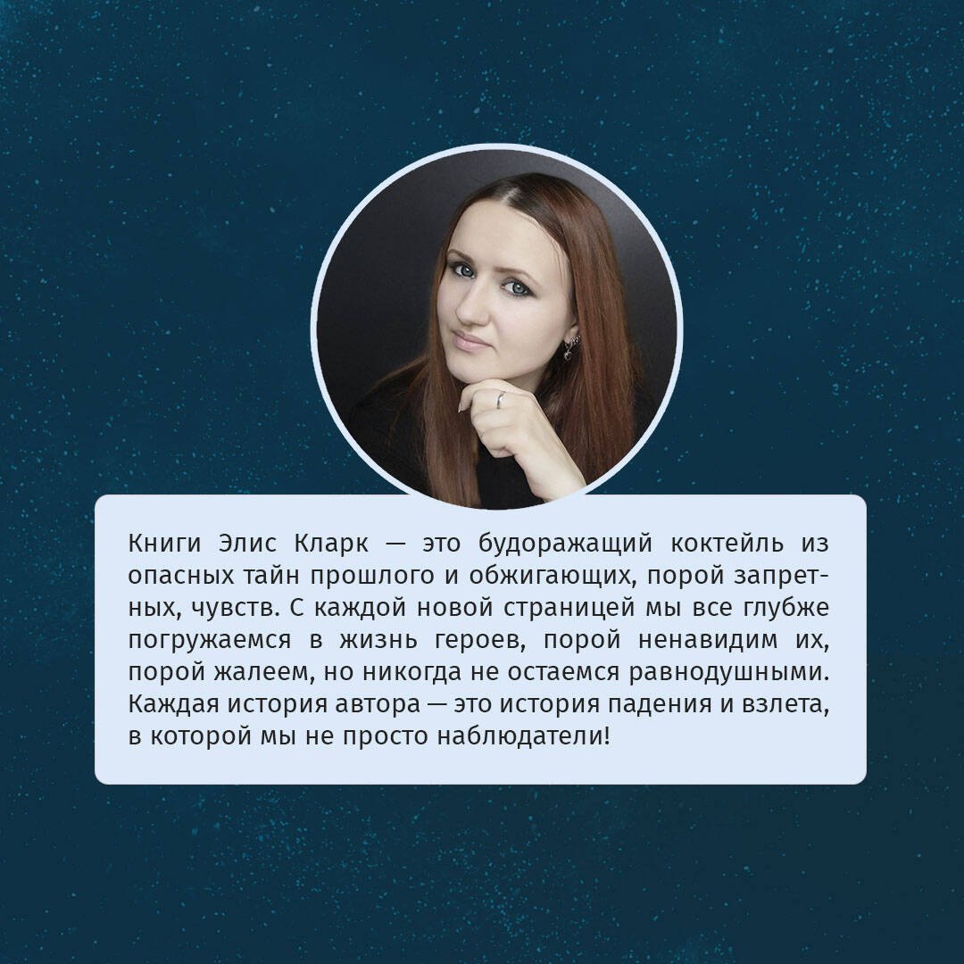 Книги Элис Кларк — это будоражащий коктейль из опасных тайн прошлого и обжигающих, порой запретных, чувств. С каждой новой страницей мы все глубже погружаемся в жизнь героев, порой ненавидим их, порой жалеем, но никогда не остаемся равнодушными. Каждая история автора — это история падения и взлета, в которой мы не просто наблюдатели!