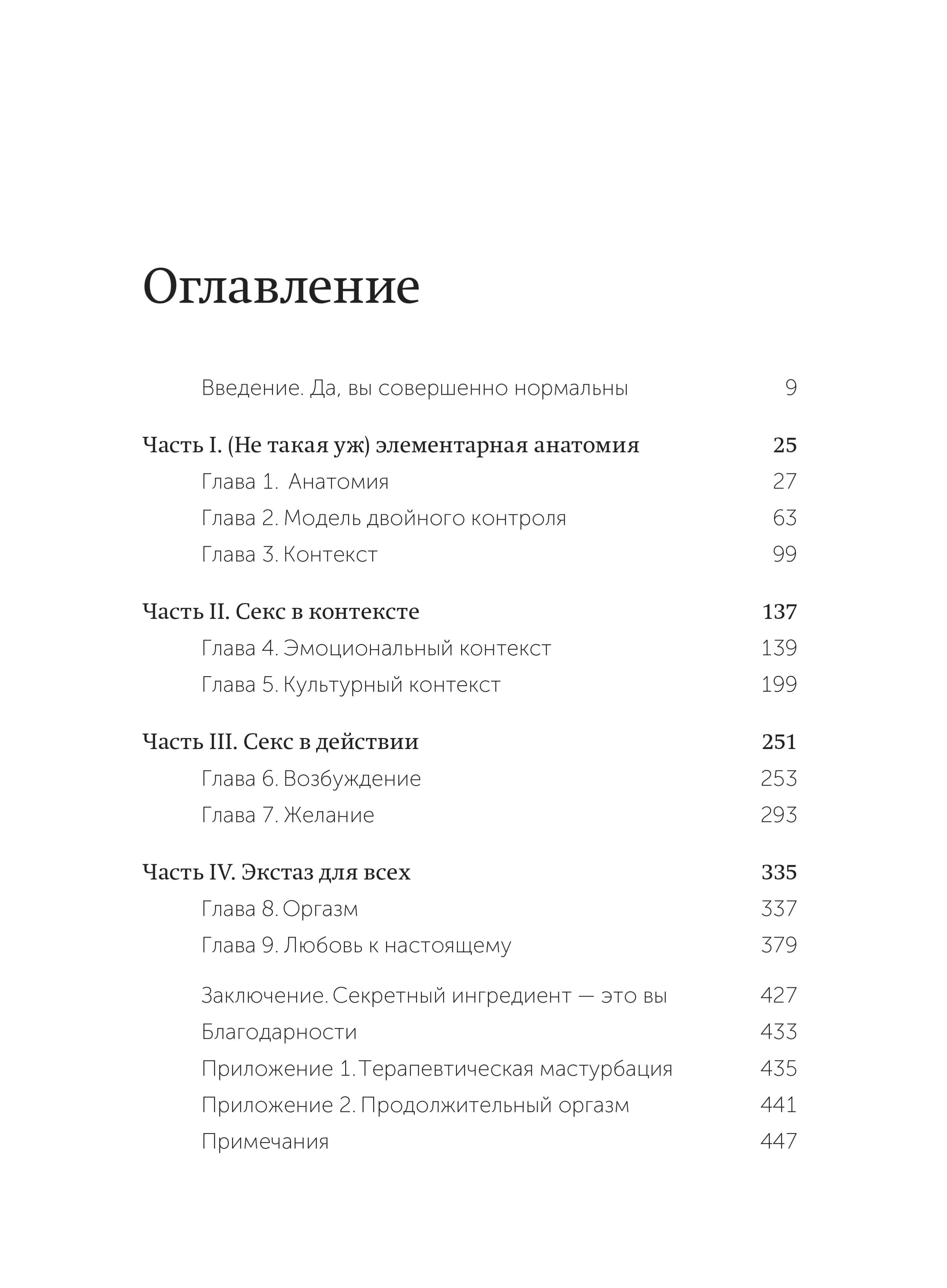 В книге четыре части. В первой части рассказывается об анатомии половых органов (глава 1), о механизме сексуальной реакции на уровне мозга (глава 2), и о взаимодействии механизмов сексуального возбуждения и подавления с другими системами мозга и внешним миром (глава 3).