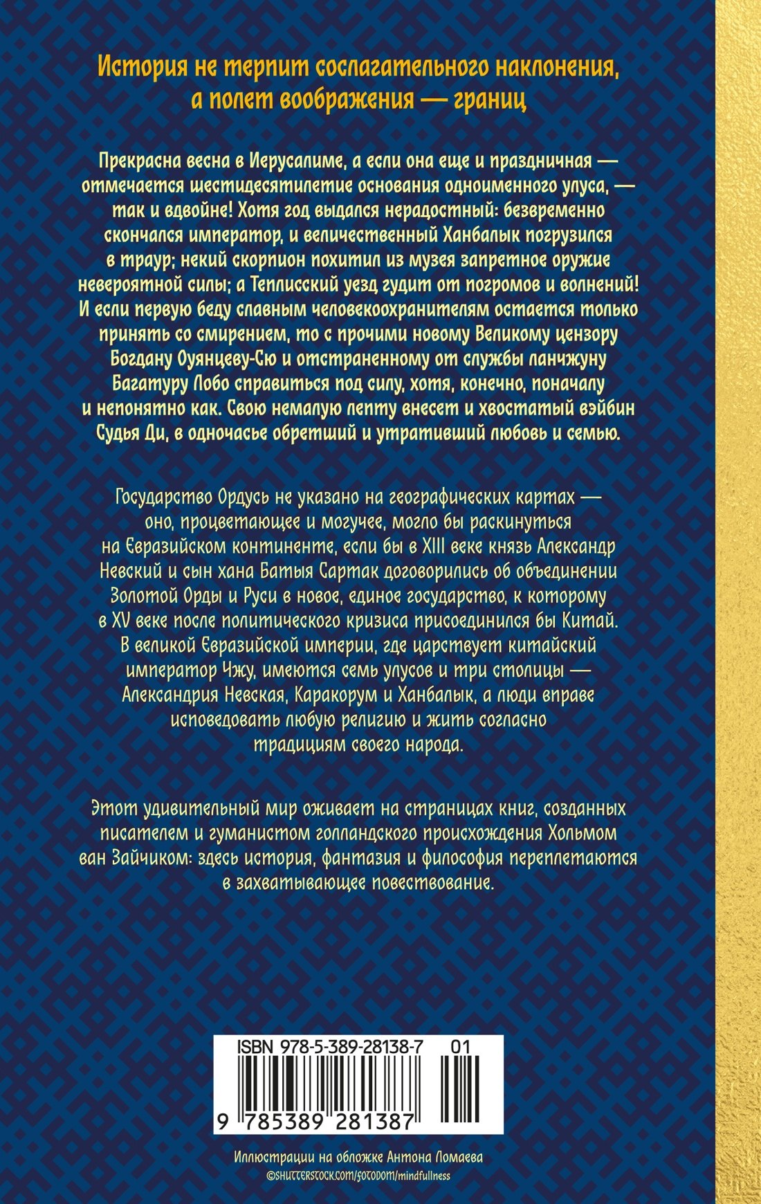 Альтернативная история. Наши дни. От Балтийского до Желтого и Красного морей раскинулась на Евразийском континенте — с заходом на Средний Восток — многонациональная и многоконфессиональная Ордусь. Образовалась она в седой древности, но число входящих в нее областей постоянно растет — всего шестьдесят лет назад был создан Иерусалимский улус. Несмотря на постигшее государство несчастье — безвременную кончину императора, — на грядущий великий Всеордусский праздник собираются гости… Разные дороги приводят туда честных человекоохранителей: достигшему высот карьеры Великому цензору минфа Богдану Оуянцеву-Сю надлежит помимо участия в торжестве решить государственную проблему с противуастероидным похищенным оружием, а пребывающему в бессрочном отпуске ланчжуну Багатуру Лобо — выследить скорпиона, ставшего причиной гибели хвостатой невесты преждерожденного Судьи Ди. Всё разрешится в Иерусалиме...