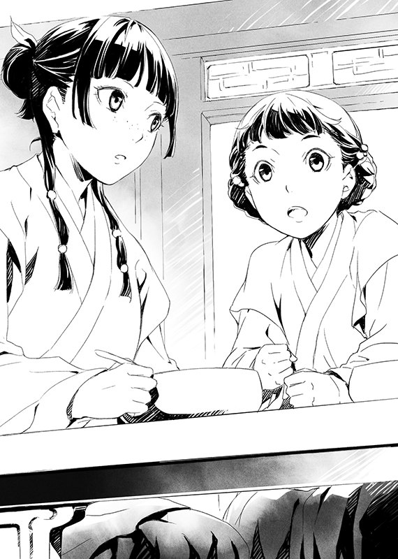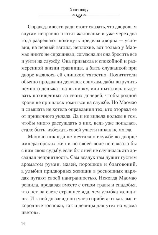 Книга соответствует 1 тому официального японского издания, 31 глава + эпилог и примечания: «Маомао», «Две наложницы», «Дзинси», «Улыбка небесной девы», «Приставленная к покоям», «Отведчица», «Ветвь», «Любовное снадобье», «Какао-бобы», «Переполох с призраком» (1-2), «Угроза», «Уход за больной», «Пламя», «Подпольная деятельность», «Пиршество в дворцовом саду» (1-3), «После празднества», «Пальцы», «Лихаку», «Возвращение в родную гавань», «Соломинка», «Недоразумение», «Вино», «Каждый остался при своем», «Мед» (1-3), «Наложница Адо», «Расчет», «Эпилог. Евнух и девушка для утех».