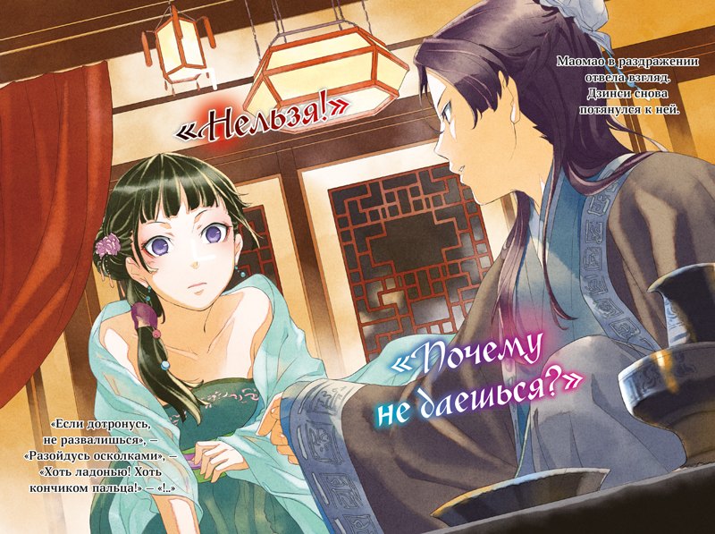 Я огромная поклонница этой серии, и меня очень порадовал перевод. В особенности впечатлило то, что текст адаптирован под эпоху, о которой в произведении и повествуется, что позволяет лучше погрузиться в историю. Произведение пусть и художественное, но довольно реалистично повествует о жизни людей разных сословий в Древнем Китае. Хотя вселенная в истории и вымышленная, явно чувствуется осведомлённость автора в теме, о которой она пишет. Персонажи живые и интересные, за их взаимодействиями очень увлекательно наблюдать. Особенно приятно, что за основу при переводе брался японский текст, и при этом оказались сохранены всевозможные отсылки на китайскую и японскую культуры, как и в оригинальном произведении. Порадовали и примечания в конце книги. Было интересно читать их, я даже узнала для себя что-то новое. Чувствуется, что над книгой работали люди, которые её любят.