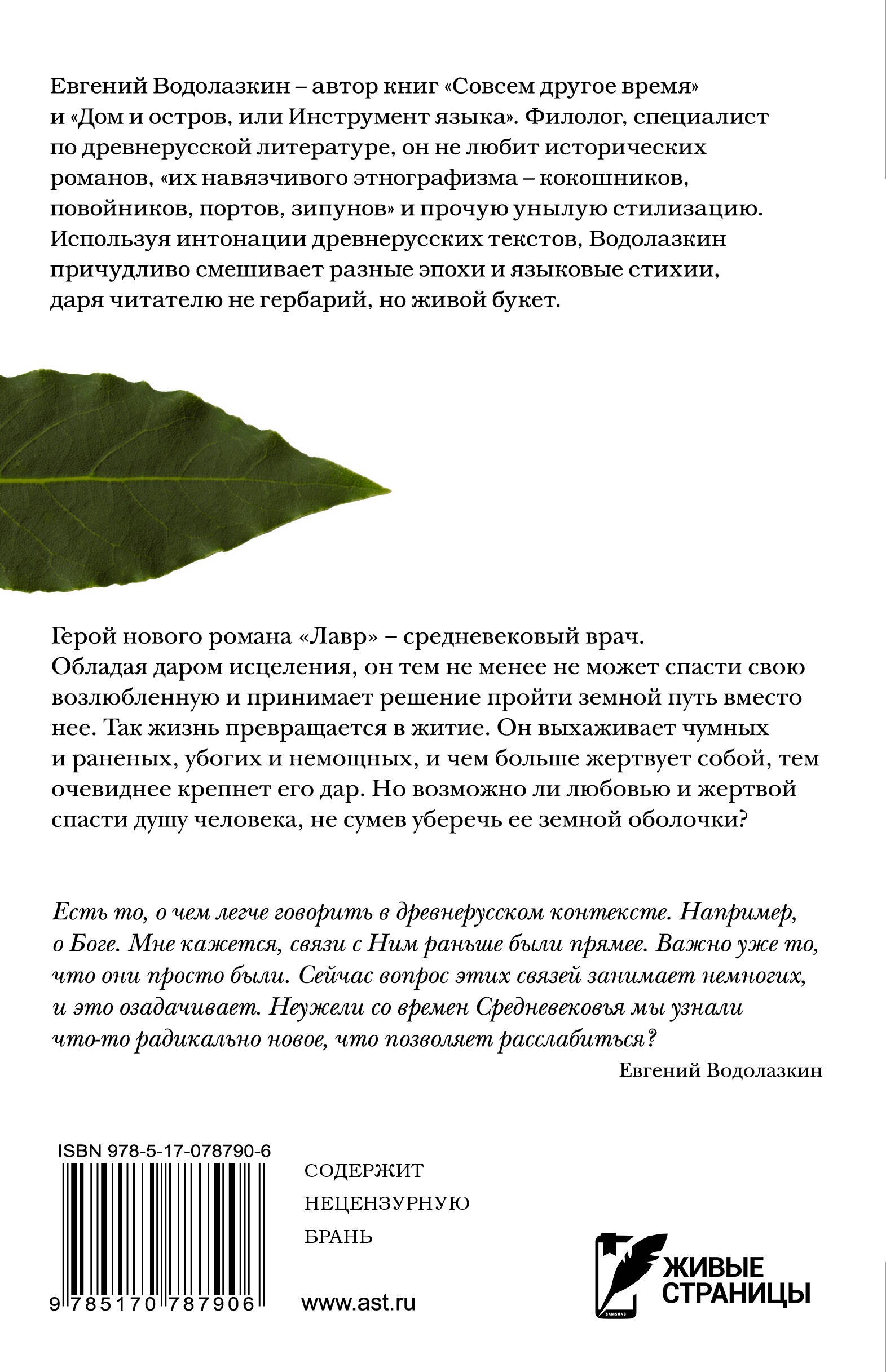 Герой нового романа «Лавр» – средневековый врач. Обладая даром исцеления, он тем не менее не может спасти свою возлюбленную и принимает решение пройти земной путь вместо нее. Так жизнь превращается в житие. Он выхаживает чумных и раненых, убогих и немощных, и чем больше жертвует собой, тем очевиднее крепнет его дар. Но возможно ли любовью и жертвой спасти душу человека, не сумев уберечь ее земной оболочки?