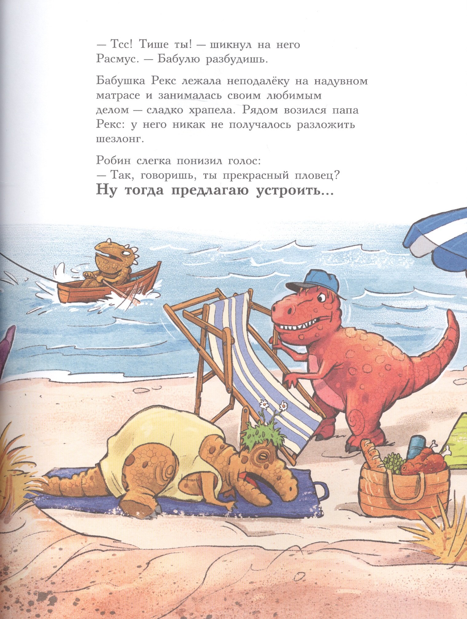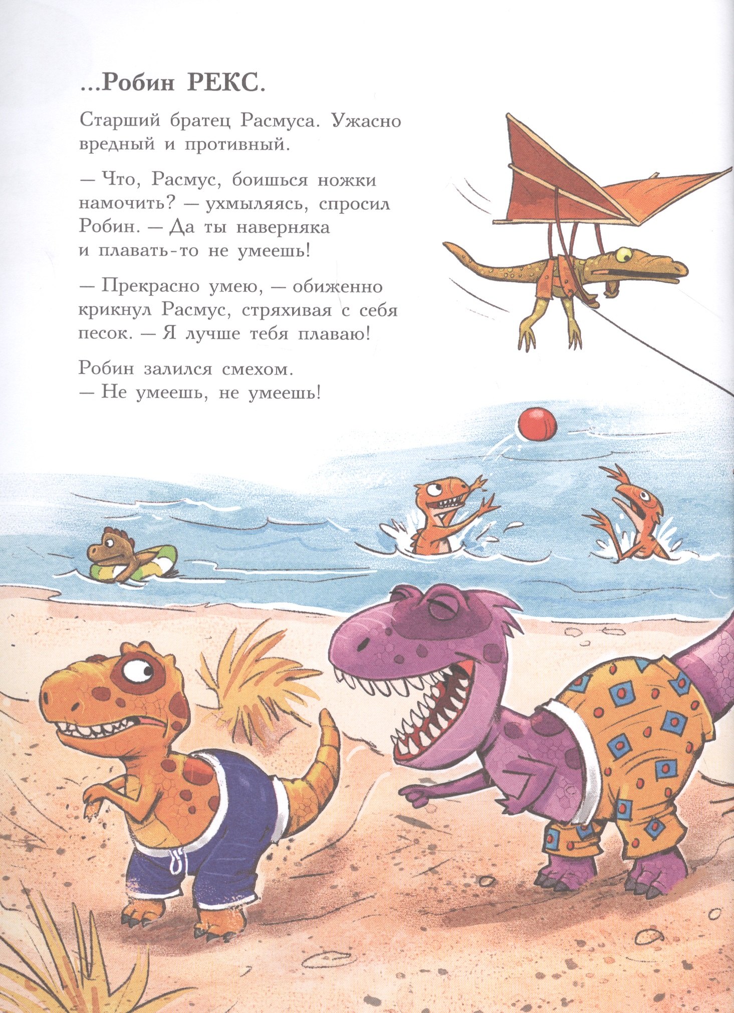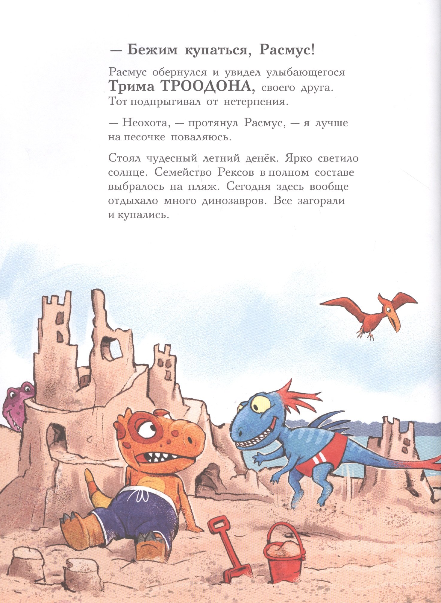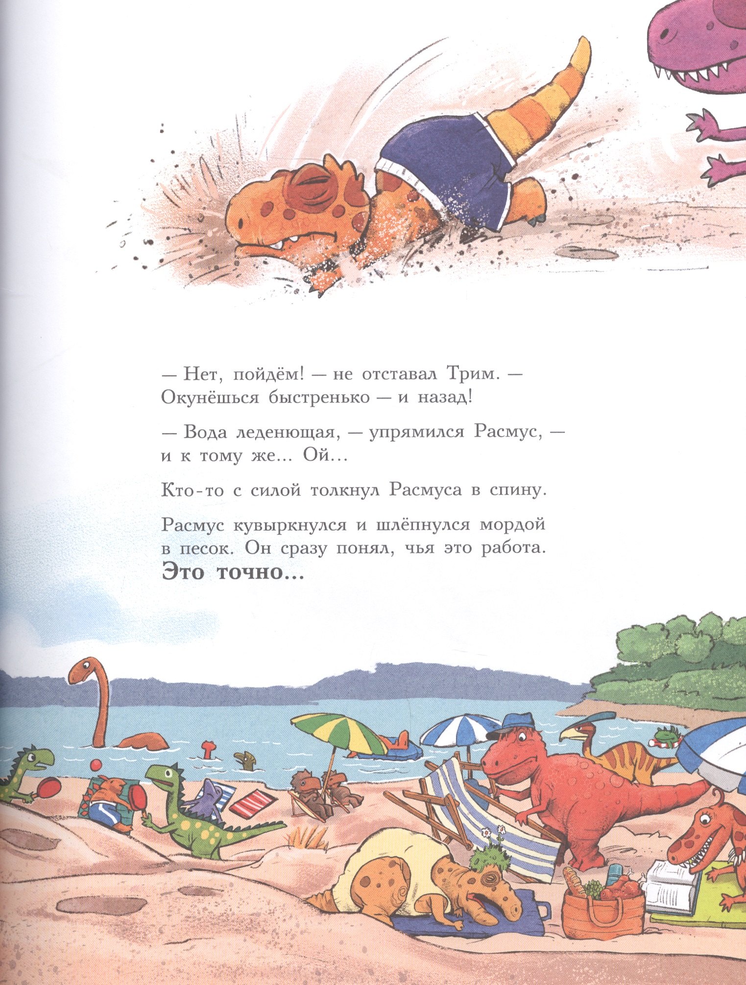 Каждая книга серии «Друзья-динозаврики» рассказывает об одном дне из жизни тираннозаврика Расмуса Рекса и его лучшего друга Трима Троодона. Во второй книге действие происходит на пляже Маленького озера, куда по случаю солнечной погоды пришла позагорать вся семья Рексов. Трим зовет Расмуса купаться, но тому больше нравится лежать на теплом песочке. Тут появляется старший братец Расмуса Робин и, как обычно, начинает задираться и дразниться. А потом предлагает Расмусу и Триму устроить заплыв до острова и обратно. Вся эта затея не сулит Расмусу ничего хорошего: сказать по правде, плавает он неважно, да ещё эти слухи о морском чудовище, которое якобы видели в озере. Скрепя сердце он принимает вызов, только чтобы доказать противному братцу, что никакой он не трус. Никто не сомневается, что победит Робин — он всегда выигрывает. Однако совершенно неожиданно у Расмуса находится защитник, и Робин получает хороший урок.