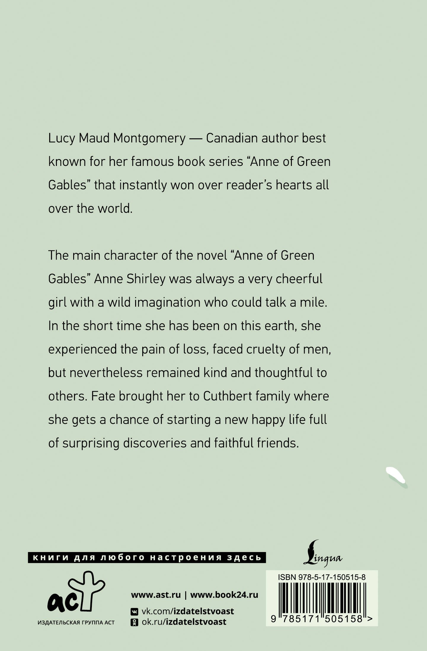 Люси Монтгомери — канадская писательница, ставшая знаменитой благодаря серии пронзительных книг о рыжеволосой девочке-сироте.Главная героиня произведения "Энн из Зеленых Мезонинов" Энн Ширли всегда была очень жизнерадостной и разговорчивой девочкой с богатой фантазией. За свою недолгую жизнь она успела изведать горечь потери и столкнуться с жестокостью и подлостью людей, но, несмотря на это, оставалась все такой же доброй и внимательной к окружающим. Волею судеб она оказывается в семье Катберт и получает шанс на новую жизнь, полную удивительных открытий и верных друзей. Текст произведения дан в оригинале в неизменном виде.