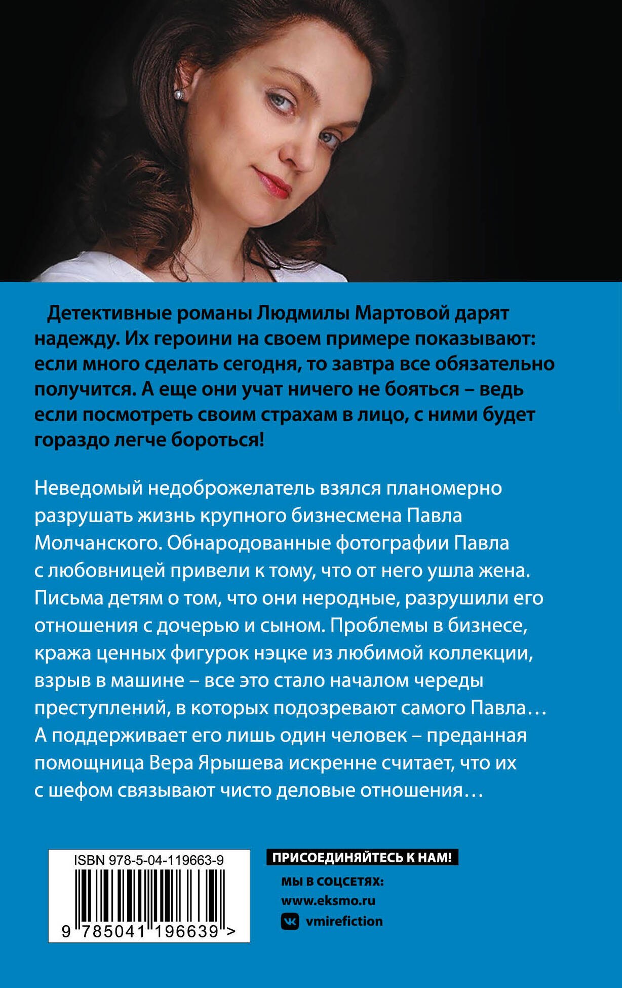 Людмила Мартова — мастер увлекательной детективной мелодрамы, автор захватывающих остросюжетных историй. Их отличает закрученная детективная интрига, лихой финал с неожиданной развязкой и, конечно же, яркая любовная линия. Героини романов Людмилы Мартовой — современные молодые женщины, которые точно знают, чего хотят от жизни.