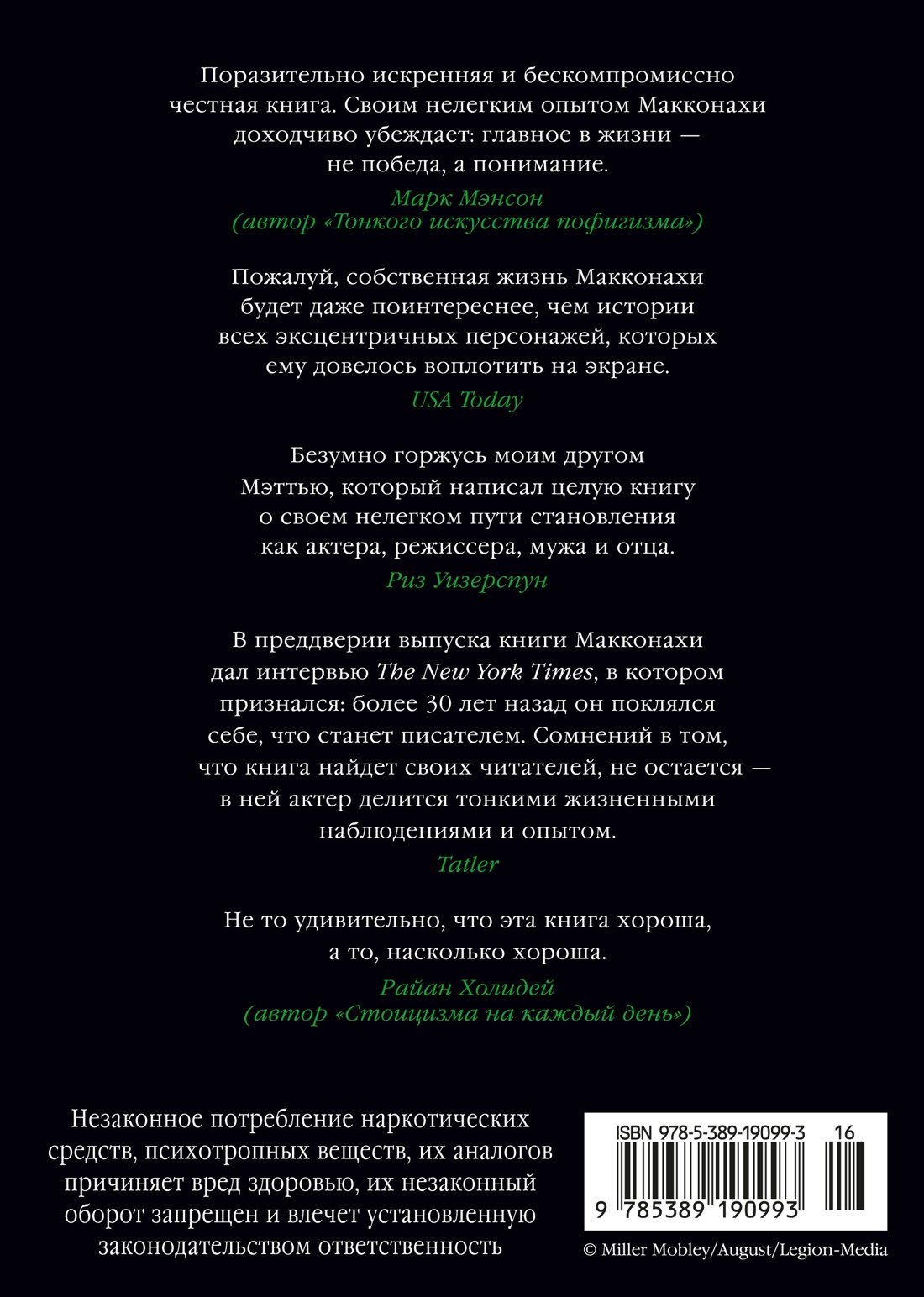 Прочла на одном дыхании. Это не типичная автобиография, мне больше это напомнило сборник очерков и зарисовок из жизни. Уроки, которые он усвоил, страхи, которые он испытывал, дела, за которые он брался. Ну, и то, как он полюбил и любит до сих пор. Про свою приверженность кинематографу. Было интересно прочесть про детство и становление. Про подготовку к ролям. Искренне и открыто. Для поклонников и просто ценителей работ Мэттью – рекомендую.