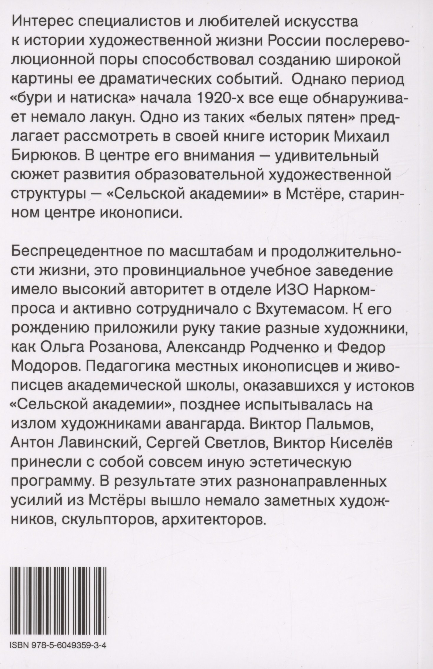 Интерес специалистов и любителей искусства к истории художественной жизни России послереволюционной поры способствовал созданию широкой картины ее драматических событий. Однако период «бури и натиска» начала 1920-х все еще обнаруживает немало лакун. Одно из таких «белых пятен» предлагает рассмотреть в своей книге историк Михаил Бирюков. В центре его внимания — удивительный сюжет развития образовательной художественной структуры - «Сельской академии» в Мстёре, старинном центре иконописи. Беспрецедентное по масштабам и продолжительности жизни, это провинциальное учебное заведение имело высокий авторитет в отделе ИЗО Наркомпроса и активно сотрудничало с Вхутемасом. К его рождению приложили руку такие разные художники, как Ольга Розанова, Александр Родченко и Федор Модоров. Педагогика местных иконописцев и живописцев академической школы, оказавшихся у истоков «Сельской академии», позднее испытывалась на излом художниками авангарда. Виктор Пальмов, Антон Лавинский, Сергей Светлов, Виктор Киселёв принесли с собой совсем иную эстетическую программу. В результате этих разнонаправленных усилий из Мстёры вышло немало заметных художников, скульпторов, архитекторов.