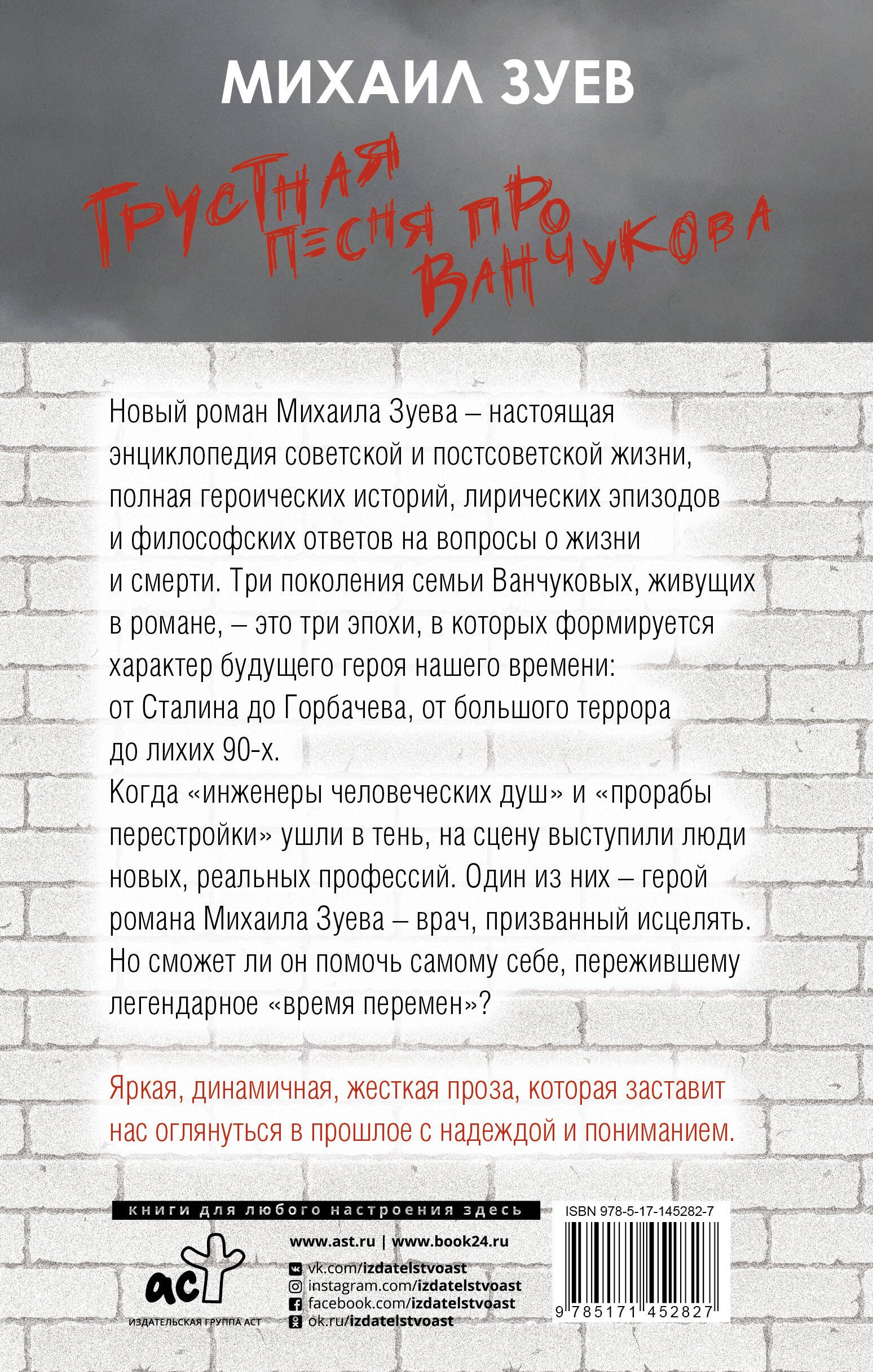 Новый роман Михаила Зуева – настоящая энциклопедия советской и постсоветской жизни, полная героических историй, лирических эпизодов и философских ответов на вопросы о жизни и смерти. Три поколения семьи Ванчуковых, живущих в романе, – это три эпохи, в которых формируется характер будущего героя нашего времени: от Сталина до Горбачева, от большого террора до лихих 90-х.