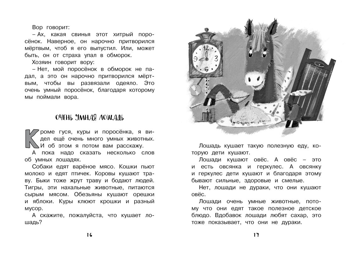 "Умные животные" , этот раздел представляет собой несколько миниатюрных рассказов о животных и адресован самому маленькому читателю. Все "герои" получаются умными, рассказы так и называются "Умная птичка", "Умная собака", "Очень умная лошадь" , а поросенок даже вора перехитрил. Глупыми в рассказах выступают люди) точнее так "плохие люди". Мужик, пытавшийся украсть поросенка; воры, похитившие собаку; мальчик, которому не понятно с каких соображений птенец понадобился; тетка, испугавшаяся кошки; человек, дразнивший обезьян. Думаю детишки поймут, что хорошо, а что плохо. Вот только лично мне за кошку обидно стало)) почему-то автор окрестил ее "сравнительно умной", видно не кошатник был Михал Михалыч.