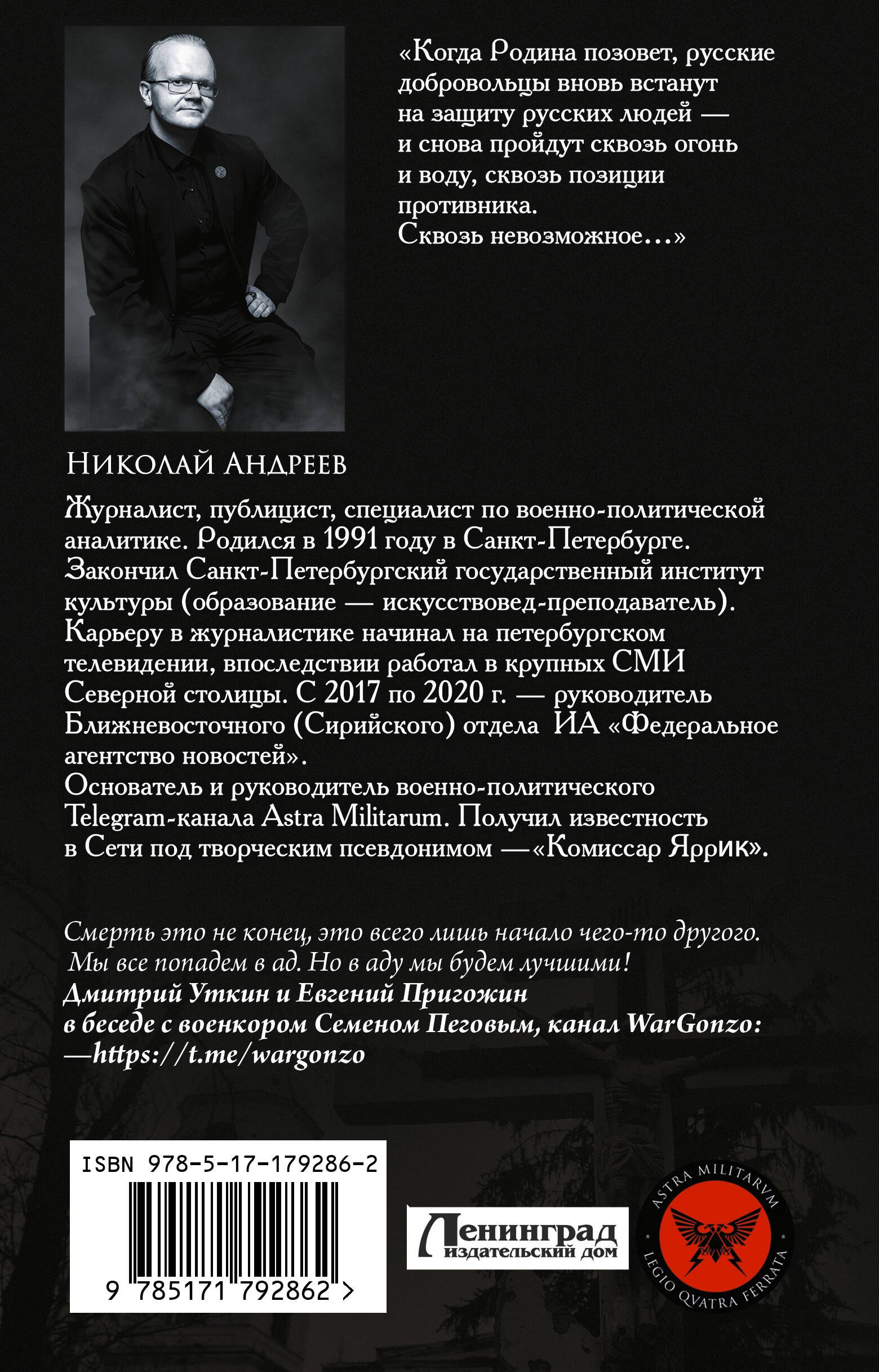 Автор книги, журналист и публицист, автор Telegram-канала Astra Militarum Николай Андреев (известный в Сети под псевдонимом Комиссар Яррик) на протяжении последних лет внимательно следил за подвигами русских добровольцев. В заключительной книге цикла "ЧВК „Вагнер“. Летопись" рассказывается об участии российских военных специалистов в боевых действиях в рамках СВО, освобождении Попасной, Соледара и Артемовска (Бахмута).
