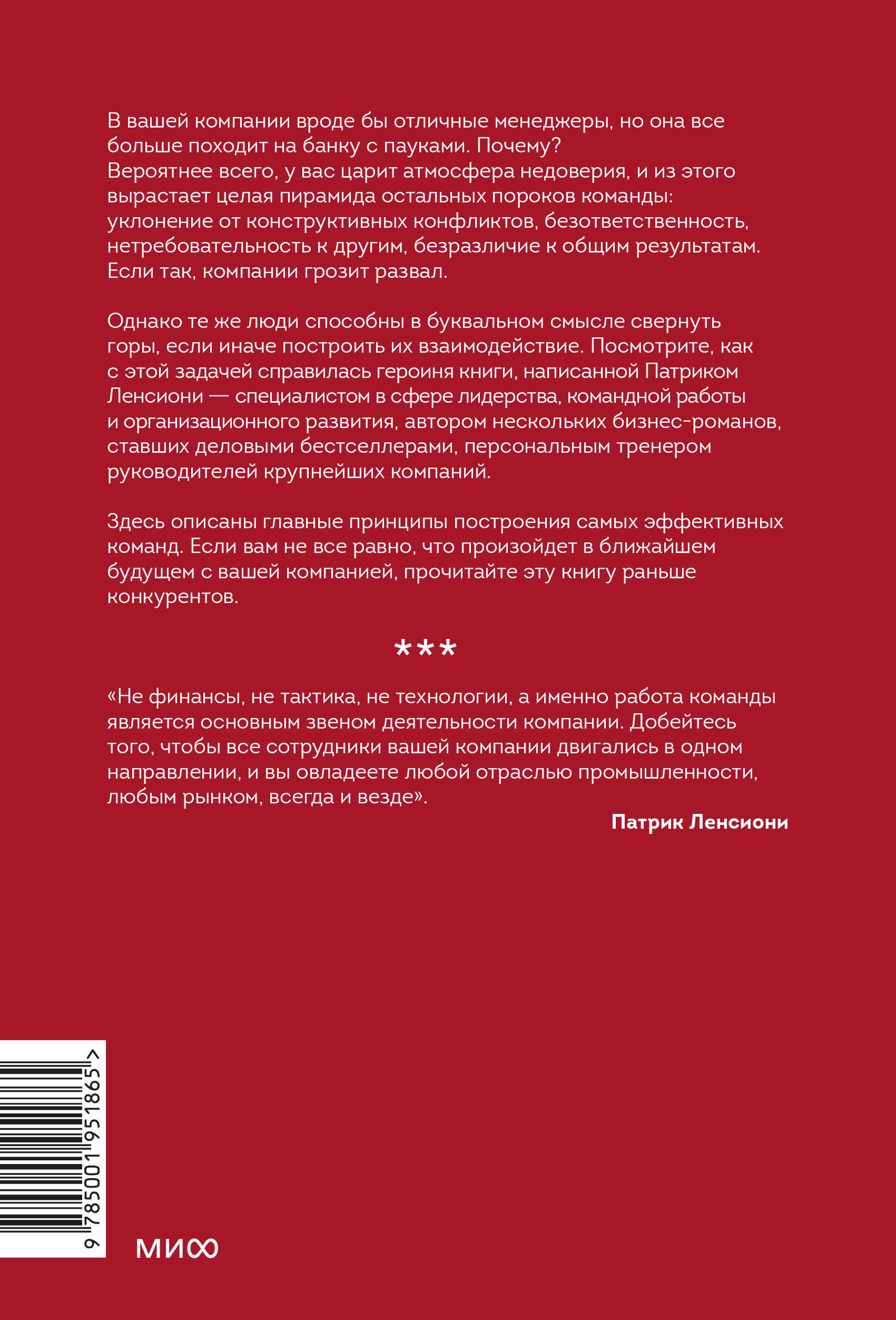 В технологическую компанию, оказавшуюся на грани упадка, приходит новый руководитель и начинает налаживать работу команды менеджеров, а вернее, создавать ее заново. Вслед за героями читатель узнает о пяти пороках, которые могут уничтожить любой коллектив, а также о том, каким образом можно их нейтрализовать и превратить свою прежде рассогласованную команду в отряд победителей.