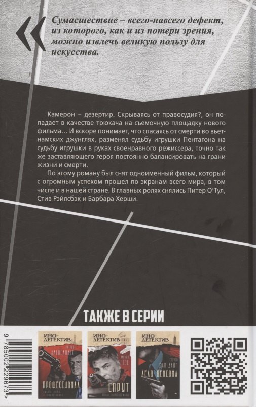 Камерон – дезертир. Скрываясь от правосудия, он попадает в качестве трюкача на съемочную площадку нового фильма… И вскоре понимает, что спасаясь от смерти во вьетнамских джунглях, разменял судьбу игрушки Пентагона на судьбу игрушки в руках своенравного режиссера, точно так же заставляющего героя постоянно балансировать на грани жизни и смерти. По этому роману был снят одноименный фильм, который с огромным успехом прошел по экранам всего мира. В главных ролях снялись Питер О’Тул, Стив Рэйлсбэк и Барбара Херши.