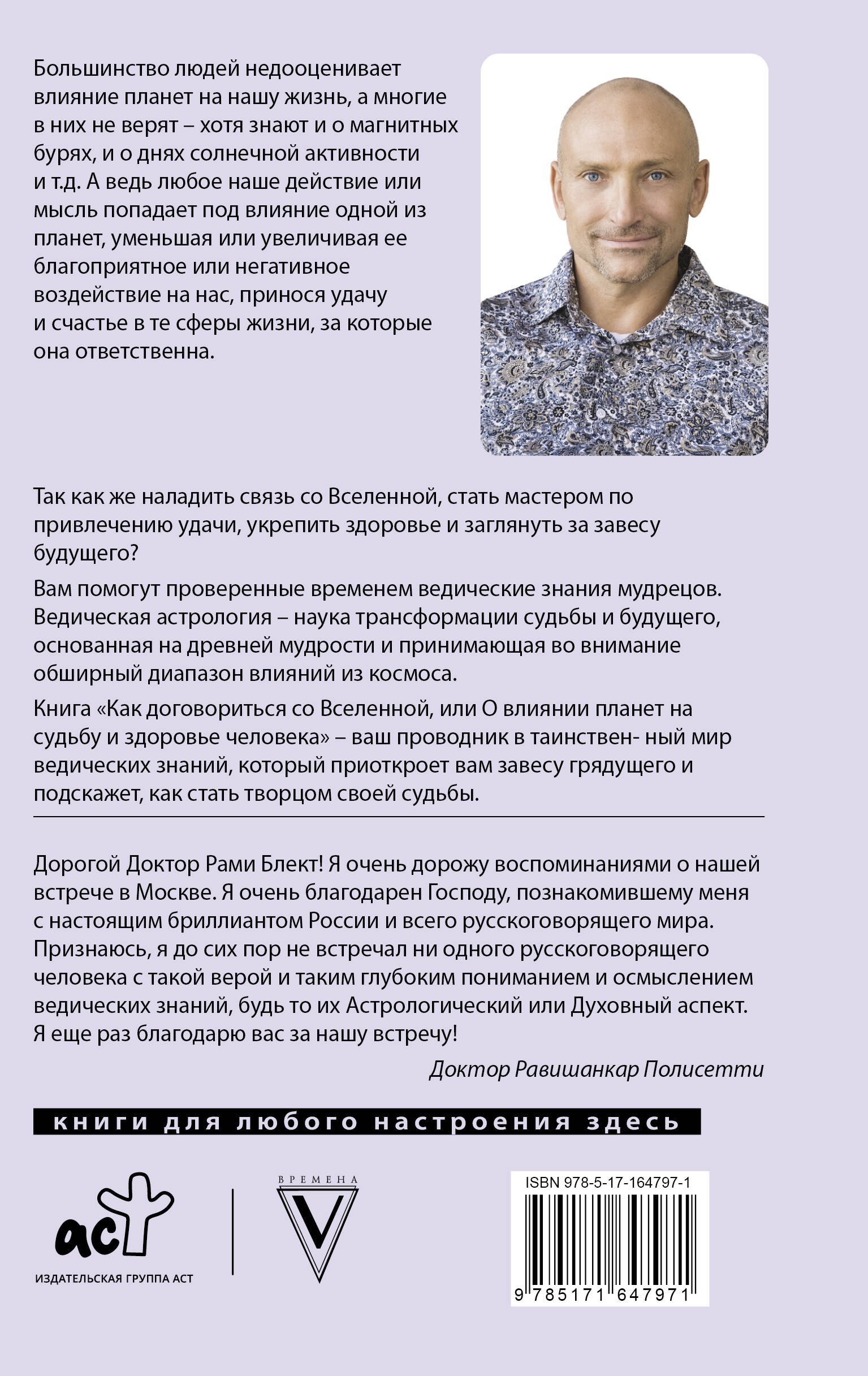 Большинство людей недооценивает влияние планет на нашу жизнь, а многие в них не верят — хотя знают и о магнитных бурях, и о днях солнечной активности и т.д. А ведь любое наше действие или мысль попадает под влияние одной из планет, уменьшая или увеличивая ее благоприятное или негативное воздействие на нас, принося удачу исчастье в те сферы жизни, за которые она ответственна. Так как же наладить связь со Вселенной, стать мастером по привлечению удачи, укрепить здоровье и заглянуть за завесу будущего? Вам помогут проверенные временем ведические знания мудрецов. Ведическая астрология — наука трансформации судьбы и будущего, основанная на древней мудрости и принимающая во внимание обширный диапазон влияний из космоса. Книга "Как договориться со Вселенной, или О влиянии планет на судьбу и здоровье человека" — ваш проводник в таинственный мир ведических знаний, который приоткроет вам завесу грядущего и подскажет, как стать творцом своей судьбы.