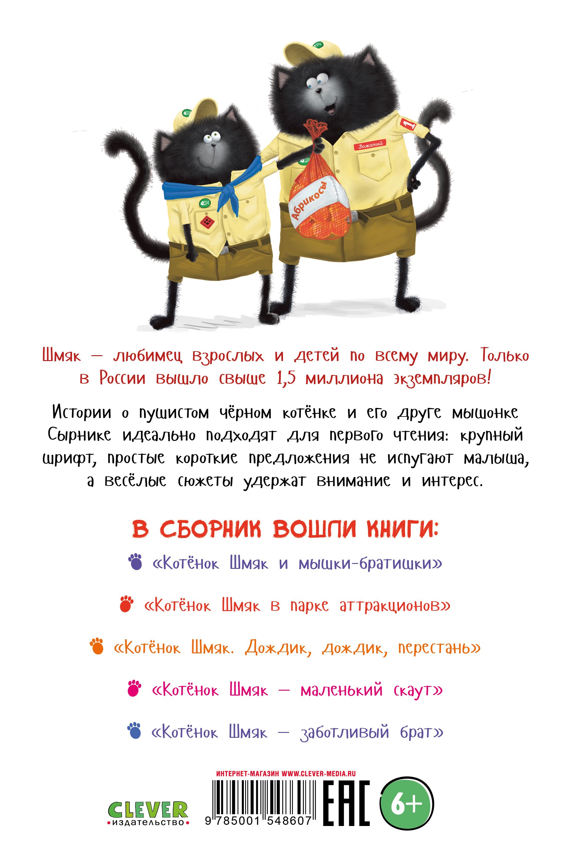 В сборник вошли книги: "Котенок Шмяк и мышки-братишки", "Котенок Шмяк в парке аттракционов", "Котенок Шмяк. Дождик, дождик, перестань", "Котенок Шмяк – маленький скаут", "Котенок Шмяк – заботливый брат".