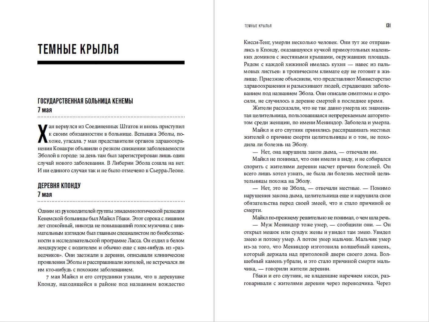 Захватывающая книга Ричарда Престона бросает читателя в самое пекло эпидемии, описывает судьбы людей, чьи героические действия преградили путь беде, показывает уязвимость систем современного здравоохранения и предупреждает нас о неизбежности новых неизвестных заболеваний.