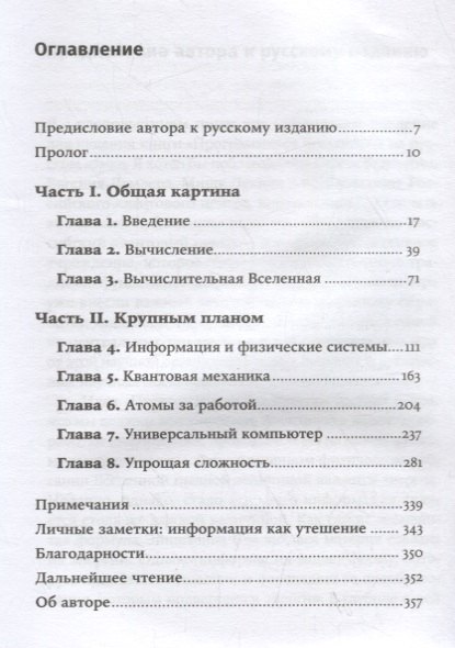 Книга не новая, прошло уже почти 20 лет. Я не знаю на сколько продвинулся автор в своих исследованиях, но даже сейчас эта работа заслуживает внимания. Следует сразу сказать, что это не типичная научно-популярная литература. То, что автор в первую очередь учёный с мировым именем видно очень ясно. Он изо всех сил пытается объяснить материал доступно, но периодически всё равно уходит на «уровень выше». Для того, чтобы от чтения была польза у вас должен быть определённый багаж знаний, номи в этом случае какие-то места придётся перечитывать и вдумываться, всё-таки описываемые концепции не интуитивны. Основная идея книги заключается в том, что наша вселенная – это гигантский квантовый компьютер, который непрерывно вычисляет. Такое объяснение по мнению автора может привести к целостному пониманию и объяснению мира, в том числе к формулированию квантовой гравитации. Всё начинается с «теоретического минимума», а именно второго закона термодинамики и важности информации для этого закона; объяснения что такое информация. Далее идёт собственно квантовая механика применительно к хранению и обработке информации. И завершается всё рассуждениями о том, почему вселенная сложная, почему есть жизнь. Рекомендую, если вы хотите достаточно глубоко погрузиться в тему