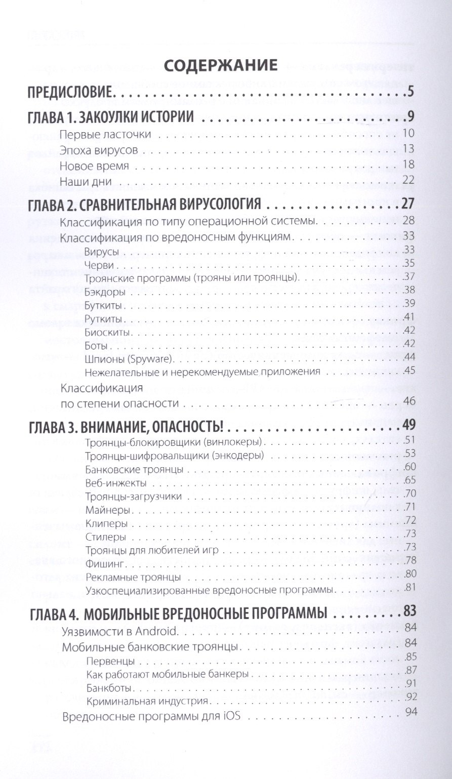 Если говорить проще, то книга представляет собой экскурс по базовым разновидностям информационных угроз, методам их проникновения на компьютер жертвы, по их диструктивным функциям и по основным технологиям обнаружения таких угроз.