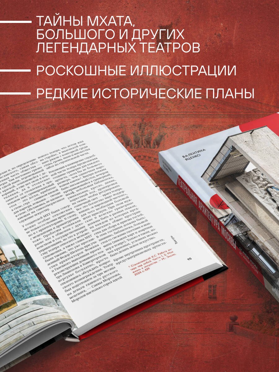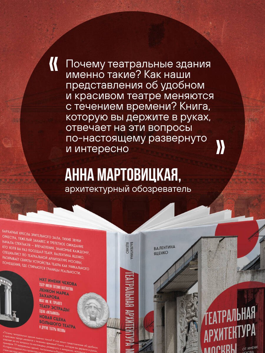 Эта книга — о театрах и о Москве, о том, как самый социальный вид искусства живет на столичных сценах. Валентина Яценко, редактор, долгое время сотрудничающая с театрами Москвы, рассказывает о том, как здание театра с его фасадами, колоннами, фальш-окнами, ложами, лепниной или аскетичной кирпичной кладкой, не просто служит фоном для игры актеров, но вступает в активный диалог с каждым, кто переступает его порог. Именно так само пространство театра становится частью взаимодействия со зрителем.