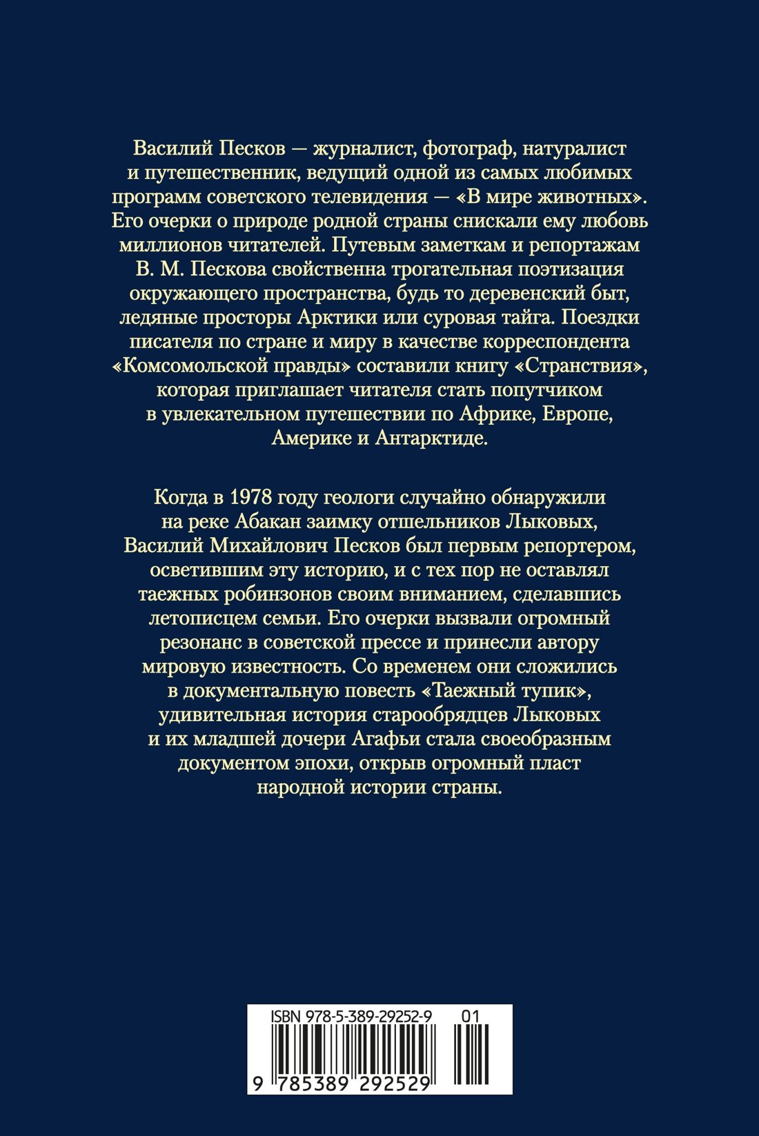 Когда в 1978 году геологи случайно обнаружили на реке Абакан заимку отшельников Лыковых, Василий Михайлович Песков был первым репортером, осветившим эту историю, и с тех пор не оставлял таежных робинзонов своим вниманием, сделавшись летописцем семьи. Его очерки вызвали огромный резонанс в советской прессе и принесли автору мировую известность. Со временем они сложились в документальную повесть «Таежный тупик», удивительная история старообрядцев Лыковых и их младшей дочери Агафьи стала своеобразным документом эпохи, открыв огромный пласт народной истории страны.