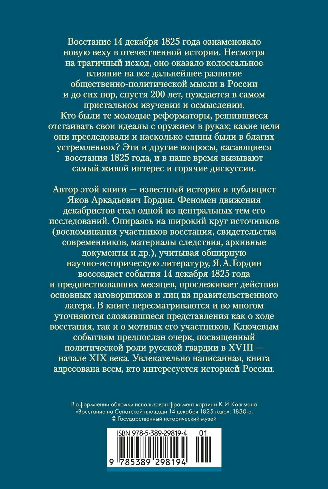 Автор этой книги — известный историк и публицист Яков Аркадьевич Гордин. Феномен движения декабристов стал одной из центральных тем его исследований. Опираясь на широкий круг источников (воспоминания участников восстания, свидетельства современников, материалы следствия, архивные документы и др.), учитывая обширную научно-историческую литературу, Я. А. Гордин воссоздает события 14 декабря 1825 года и предшествовавших месяцев, прослеживает действия основных заговорщиков и лиц из правительственного лагеря. В книге пересматриваются и во многом уточняются сложившиеся представления как о ходе восстания, так и о мотивах его участников. Ключевым событиям предпослан очерк, посвященный политической роли русской гвардии в XVIII — начале XIX века. Увлекательно написанная, книга адресована всем, кто интересуется историей России.