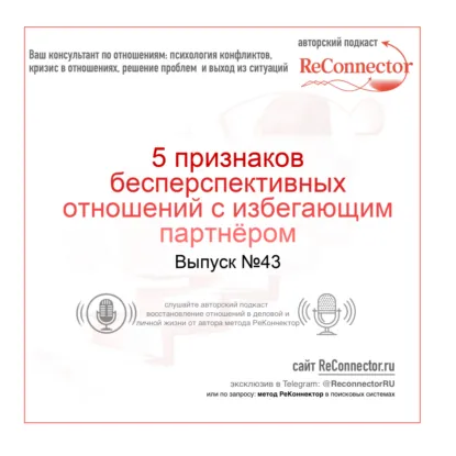 Используя разработанный мной Метод РеКоннектор и уникальные Модели Отношений РеКоннектор, я помогаю распознать деструктивные сценарии и понять, какие именно признаки указывают на отсутствие будущего в ваших отношениях. Этот подкаст станет зеркалом, в котором вы увидите реальность вашей ситуации без иллюзий и самообмана.